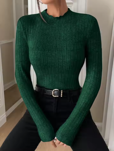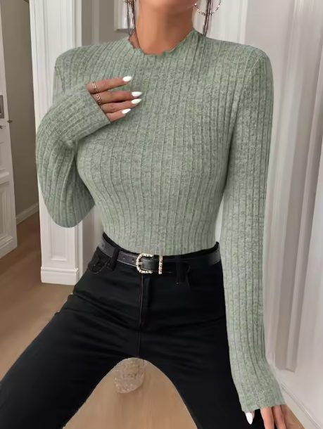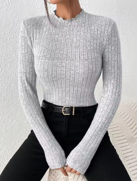 Con il suo design a coste elasticizzato, questo maglione a maniche lunghe esalta la silhouette mantenendo il massimo comfort. Il dettaglio del collo leggermente ondulato aggiunge un tocco chic che lo rende perfetto sia per look casual che eleganti.